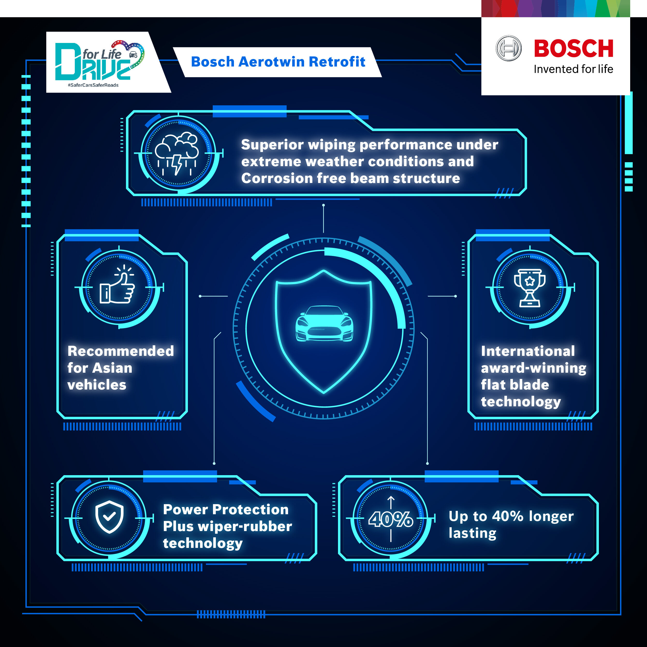 Aerotwin Retro-fit Range: Flat Wiper Blades for Retrofitting in Passenger Cars Aerotwin flat wiper blades can also be retrofitted on vehicles with standard wiper blades and conventional hook-type wiper arms. The Retro-fit range includes the Aerotwin with a pre-assembled adapter: Simply fit and engage – that’s all there is to it. Advantages: Top quality wiper action -High-tech spring strip and aerodynamically optimised profile for perfect wiping over the full area -Power Protection Plus rubber provides perfect wiper performance, long service life and gentle wiper action Greater driving comfort -Reduced surface area minimises wind noise -Better equipped for winter conditions, as ice can no longer form on the metal frame and joints -Straightforward wiper blade replacement thanks to preassembled adapter for vehicles with hook-type wiper arms Innovative design -Integrated aerodynamic spoiler -Bosch’s unique adapter system is simple to use and can be adapted for future requirements Longer service life -Uniform contact pressure spreads wear evenly -Fewer problems with insects and stubborn dirt